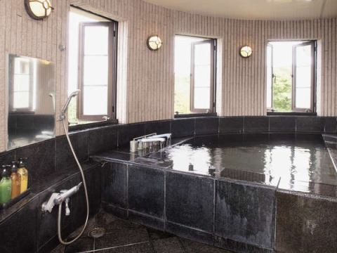 浴室は、黒御影石の浴槽に小室温泉が満たされております。各お部屋ごとの時間制ではなく、空いていればいつでもご利用いただけます。